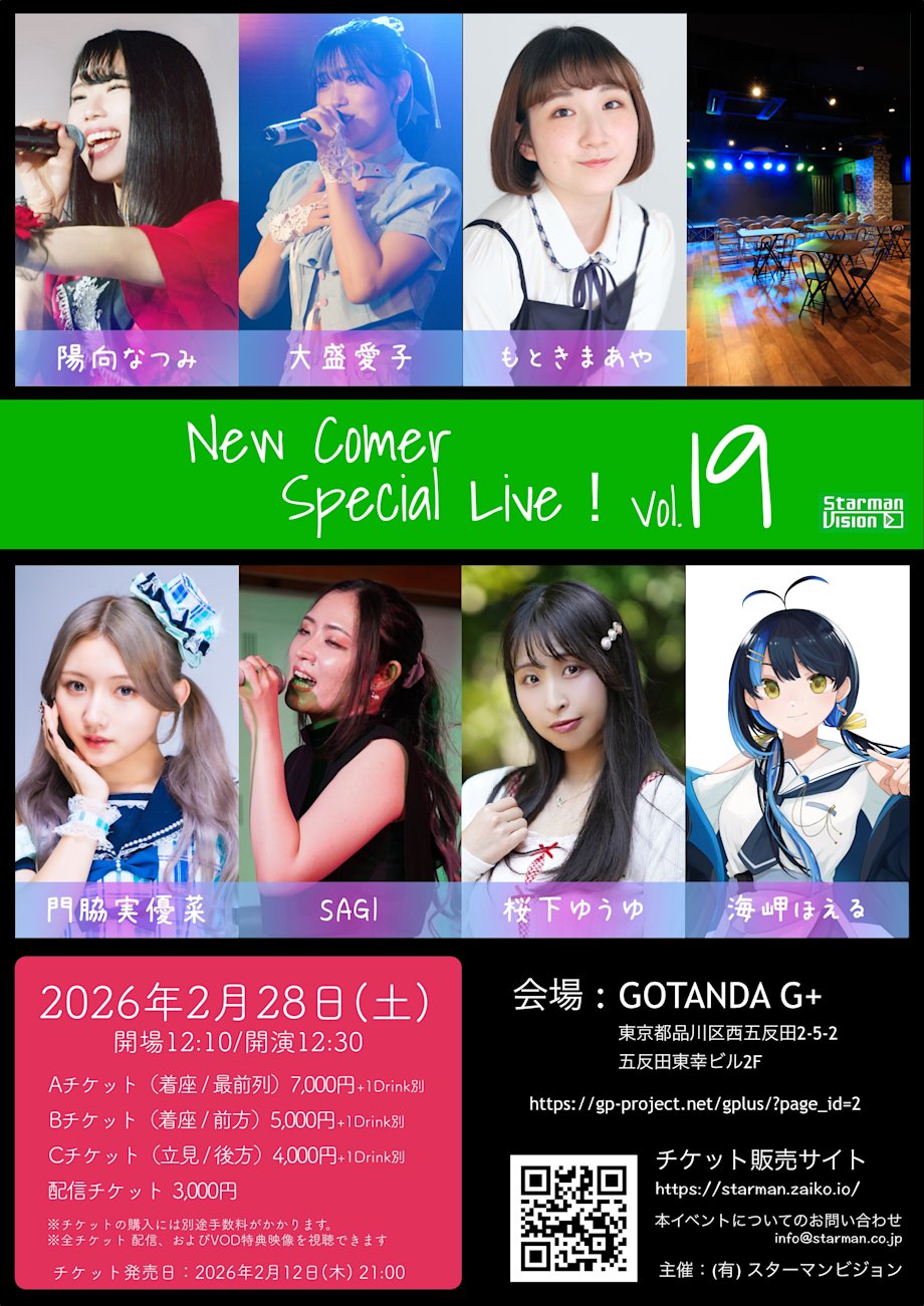 「New Comer Special Live Vol.19」 開場12:10 開演12:30 出演: 陽向なつみ 大盛愛子 もときまあや 桜下ゆうゆ 海岬ほえる 門脇実優菜 SAGI 2/12(木)21時チケット発売 https://starman.zaiko.io/e/newcomer-19