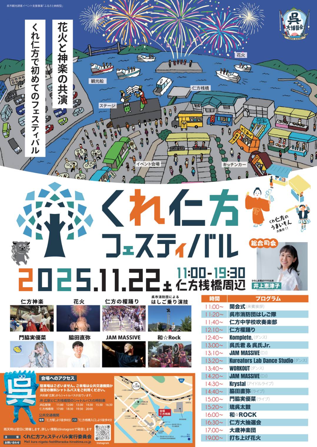 https://kure-trip.jp/events/75 令和7年11月22日(土)11:00~19:30開催場所:仁方桟橋周辺 花火大会あるよ!!! 15:00-15:20に出演決定!!!